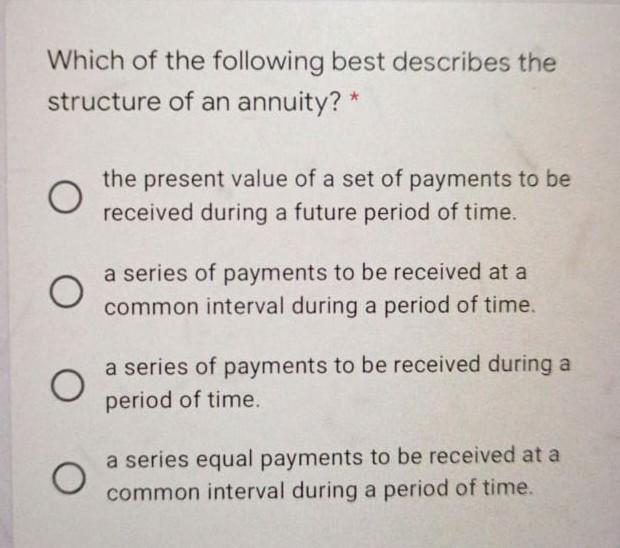 The period of time from the effective date of the contract to the date of its termination 2. Which Is The Best Option For An Annuity Settlement. Examveda Which of the following statements best describes an ordinary annuity.